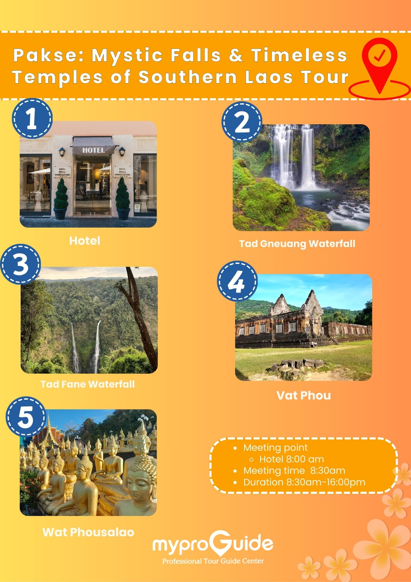 - Departure: Get picked up at 08:00 - 08:30. Enter your preferred location at checkout. The operator will make the final confirmation accordingly. - Hotel Lobby pakse City Area