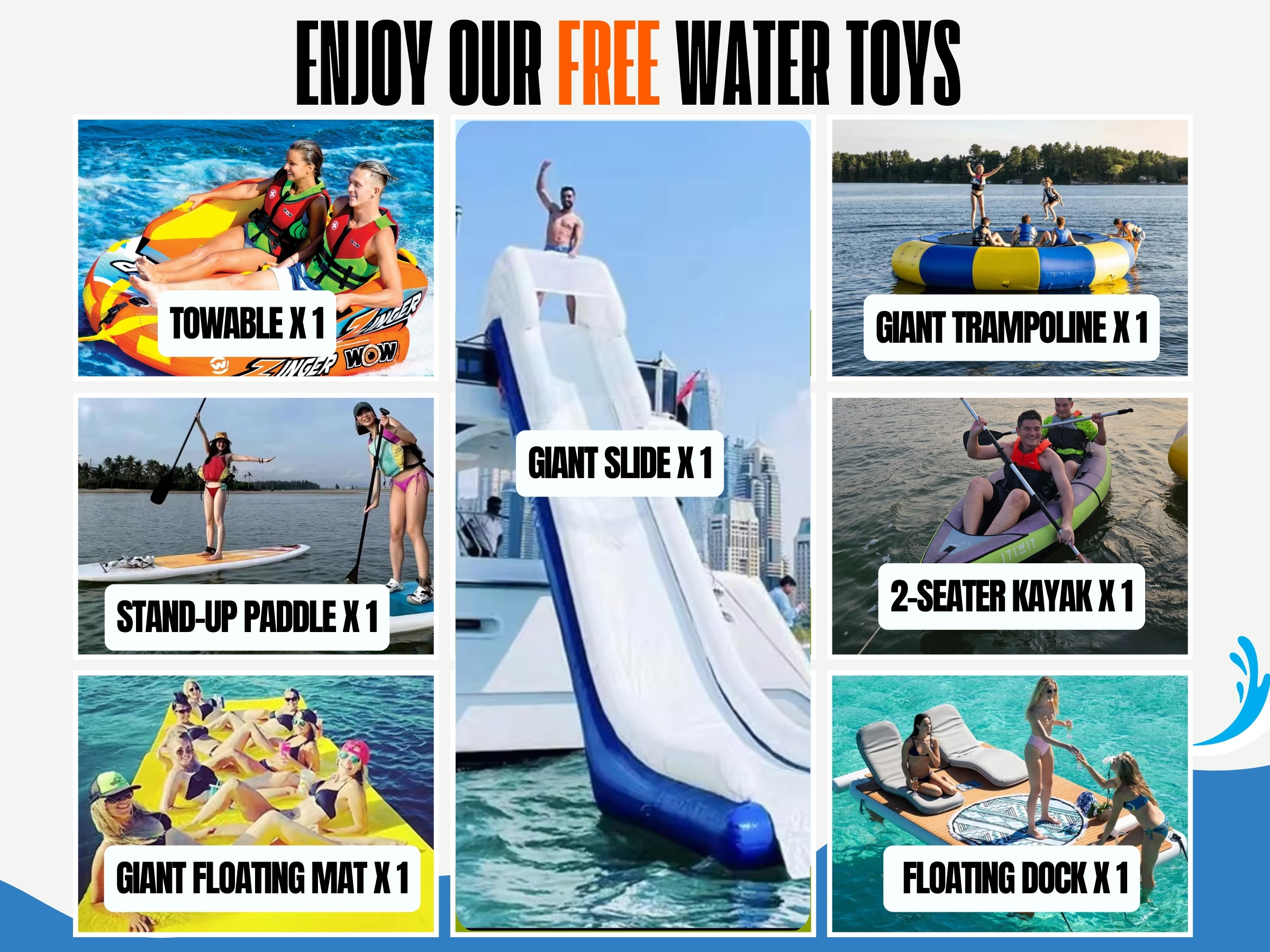 - Complimentary use of Kayaks, Standup Paddle Board, Floating Mat and water toys