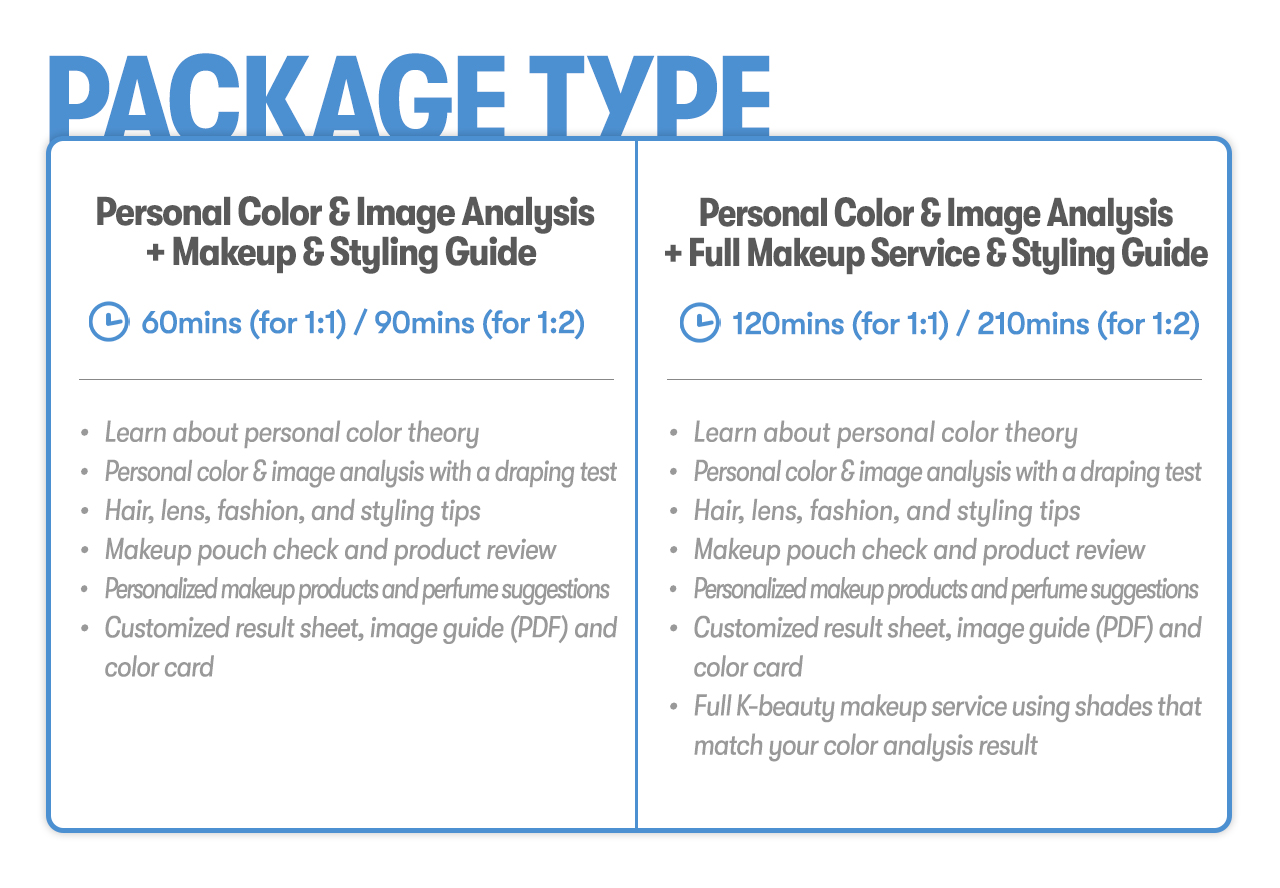 - 1:1 (60 mins) or 1:2 (90 mins) personal color & image analysis