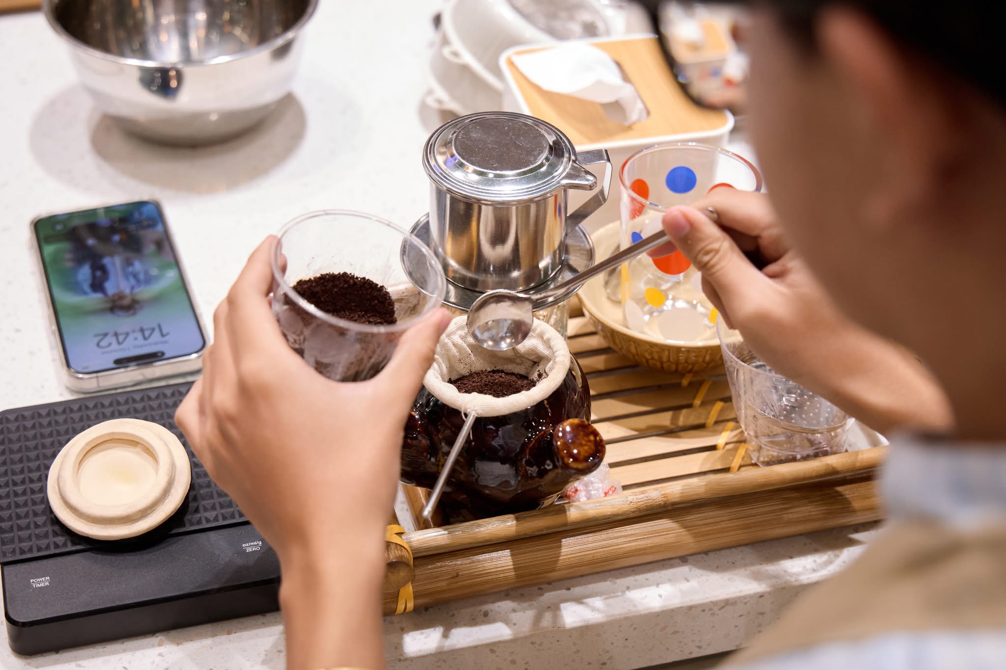• Experience the unique Saigon's “Vot” brewing method, Vietnam’s traditional nel drip coffee technique