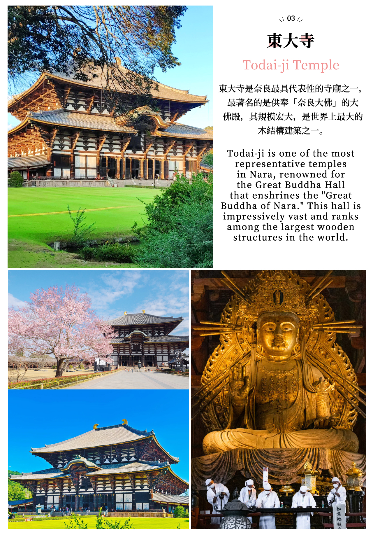 - [Attraction/experience] 09:00, 3 hour(s), Self-guided, Nara Park, Tōdai-ji, Kasuga Shrine, Nara Kasuga Hani Chaya, Nara Park area: 3 hours of free time! Here, you can interact with the adorable deer and experience their loveliness and gentleness. You can also visit Todai-ji Temple, a World Heritage Site that features the largest wooden building, or head to Kasuga Taisha Shrine to admire the beauty of a Japanese shrine. You are free to have lunch at a teahouse near Nara..Some attractions might need to skipped because of capacity or weather conditions