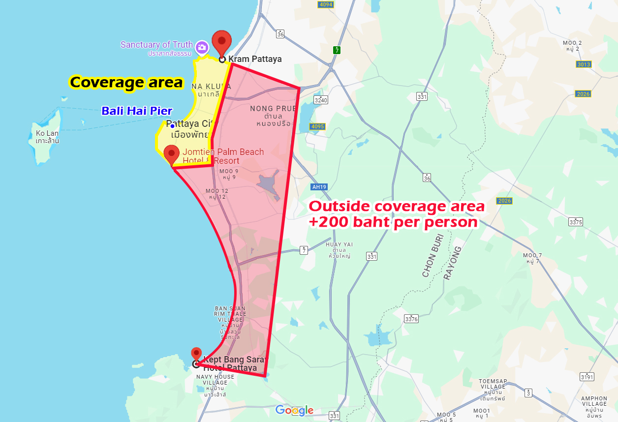 - An additional pick-up fee of 200 baht per person applies for locations outside the central Pattaya area, including the Jomtien region.