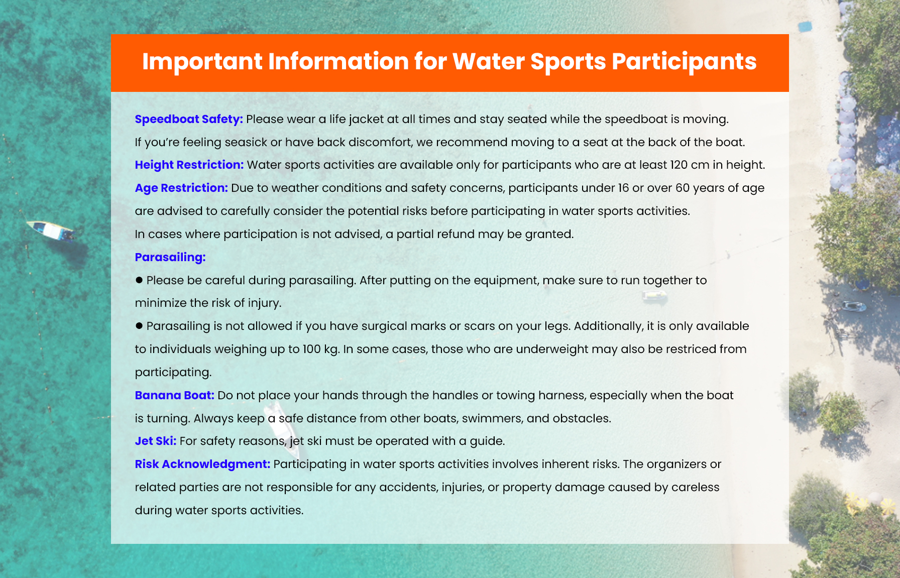 Due to weather conditions and safety concerns, participants under 16 or over 60 years of age are advised to carefully consider the potential risks before participating in water sports activities.