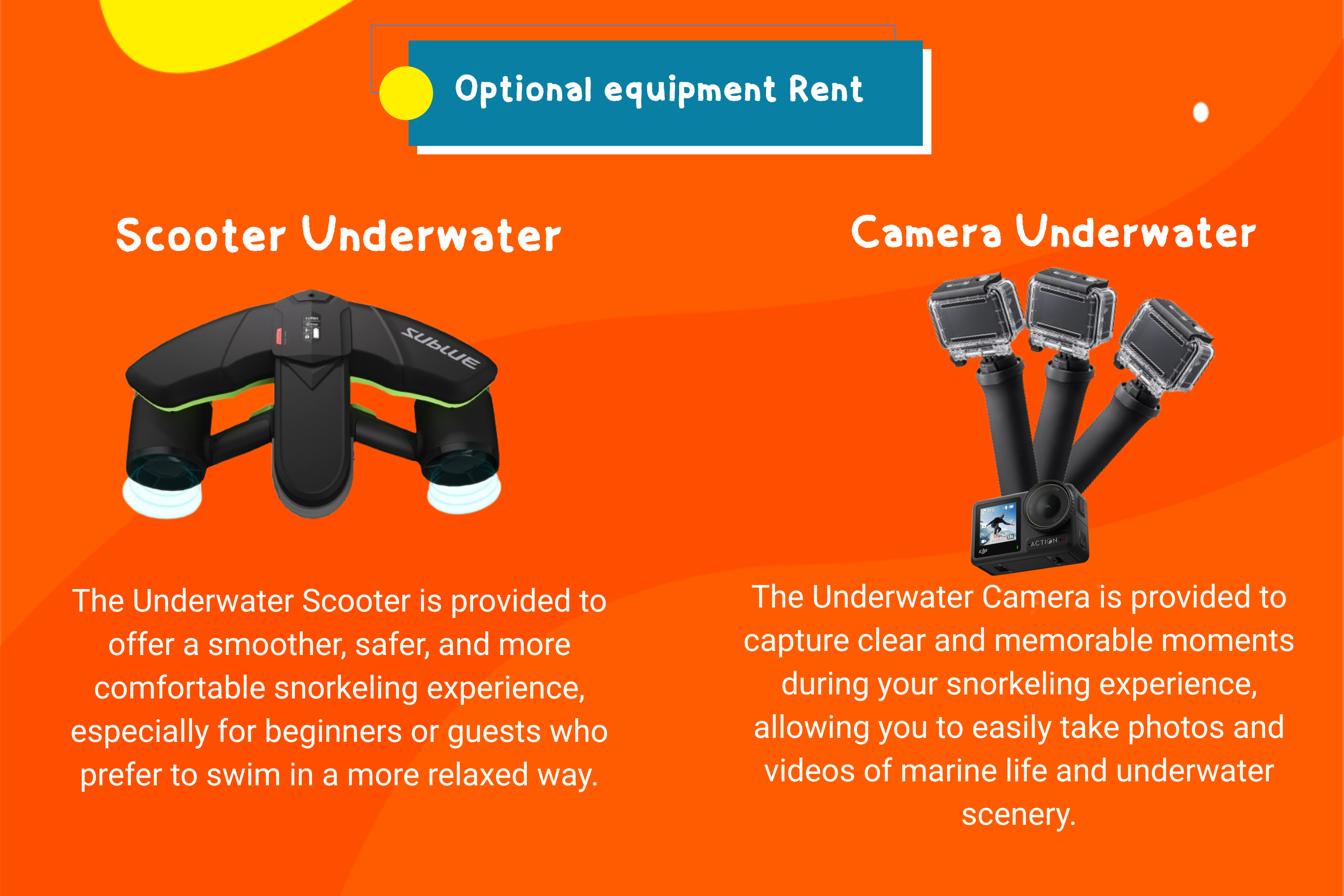 - Sharing Camera Underwater Gopro / DJI Action (photo and video taken by the snorkelling activity operator) attention Please understand that we do not provide professional photographers for underwater photography.