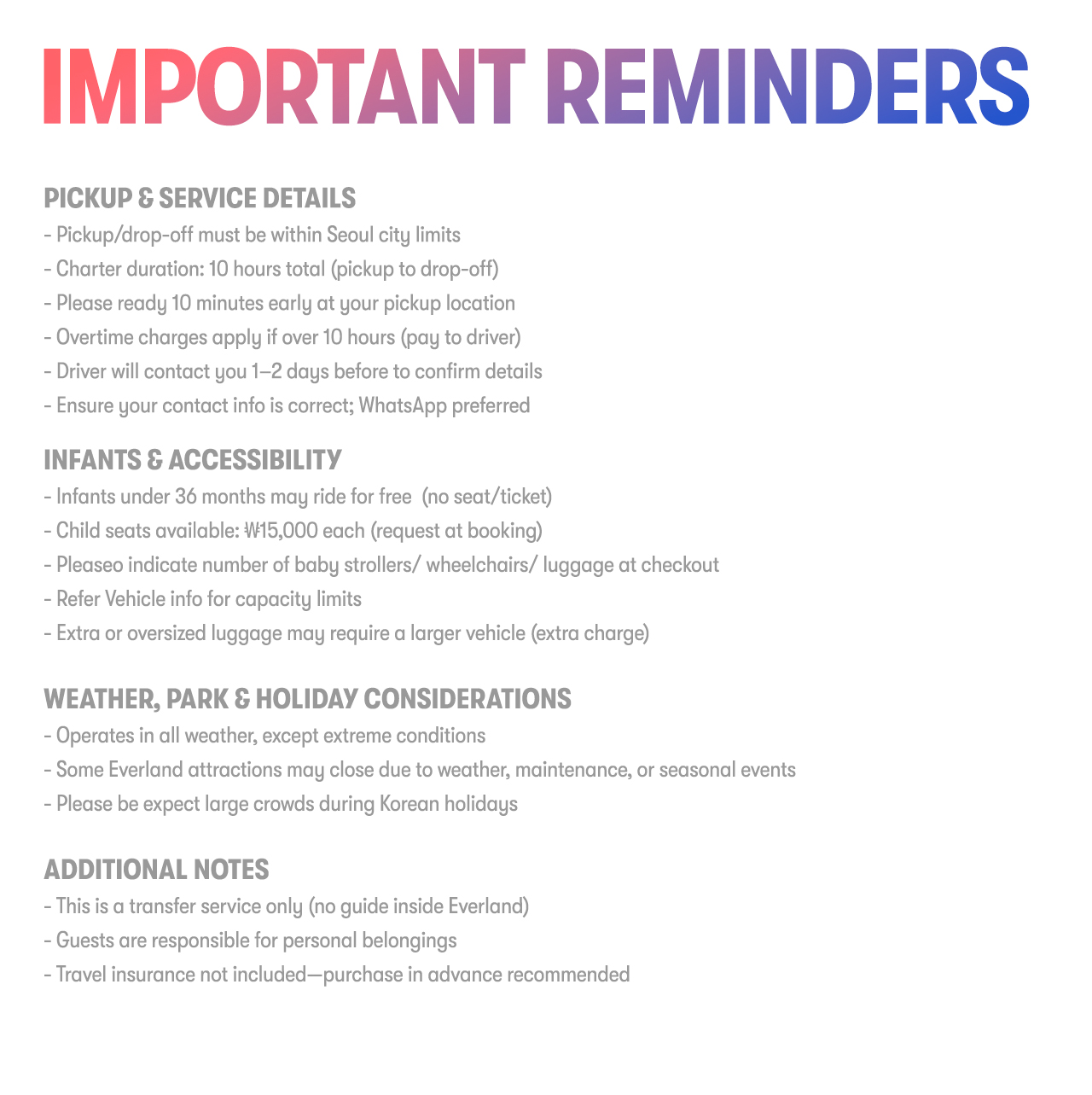 - Private round-trip car charter (Seoul → Everland → Seoul)