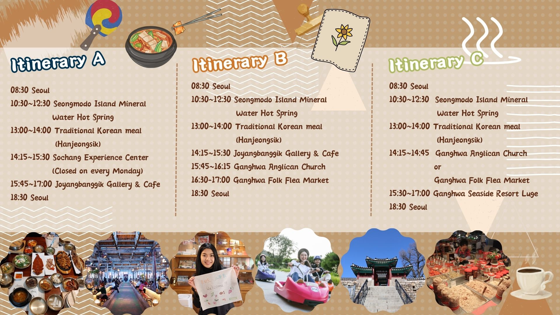 - [Attraction/experience] 10:30, Ganghwa Seongmodo Island Mineral Water Hot Spring, Please refer to the activity main page for more details