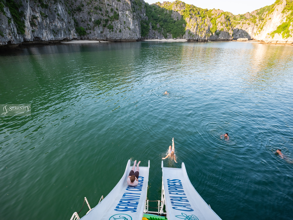 - [Attraction/experience] Guided tour, Lan Ha Bay, Back to the cruise. Time to experience interesting activities: Swimming in the middle of the sea, boat jumping, sliding down from the top deck to cool water, and kayaking