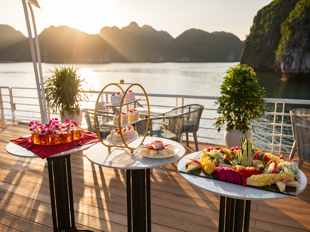 - [Dining] Snack, Small sunset party is served with fresh fruit, biscuits & tea