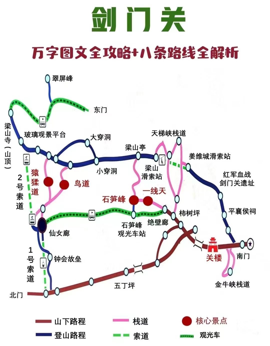 - The scenic area is famous for the Jianmen Pass, known as "one man can hold the pass against ten thousand," and the recommended route is: Guanlou → Bird Path / Ape Path → Viewing Platform.