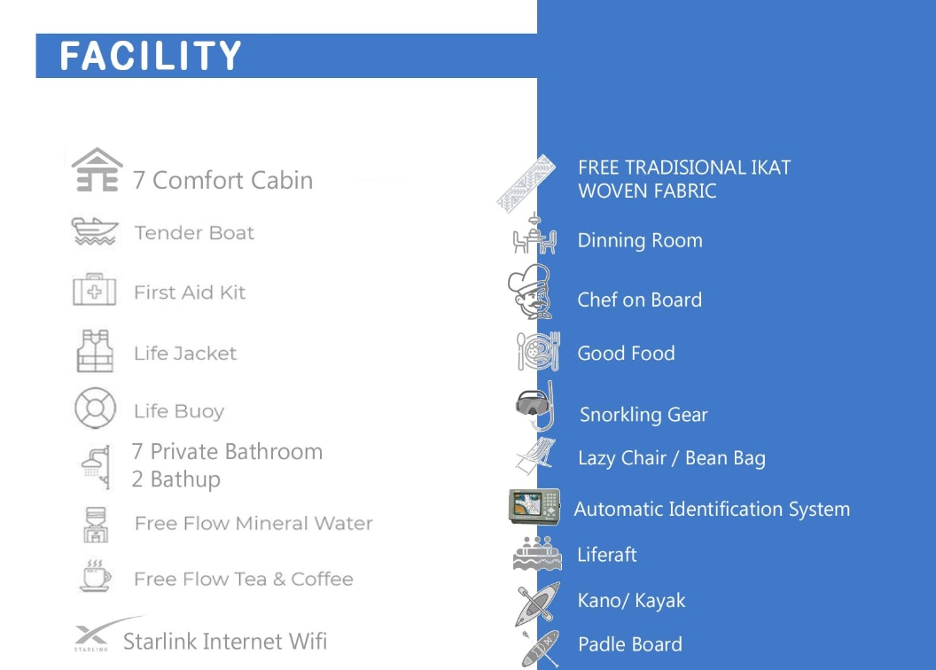 - [Accommodation] Queen-size bed (for 2 people), Private bathroom, person(s) per room; Flores Cabin facilities: Air conditioner (AC), Double size + single bed, Sea view window, Electric plugs, Towel, Linen, Private bathroom, 2-3 people in one cabin, Private balcony