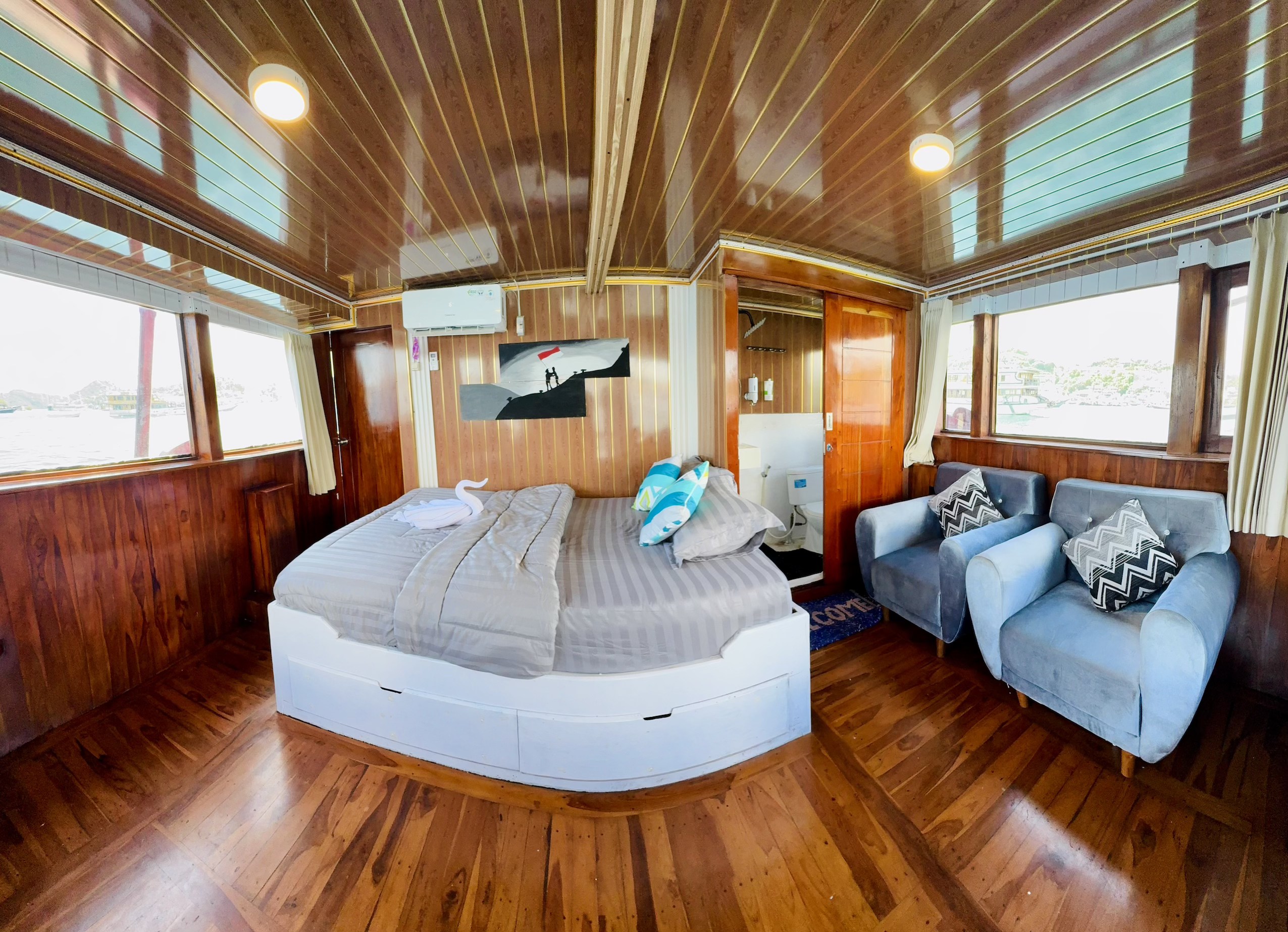 - Flores Cabin facilities: Air conditioner (AC), Double size + single bed, Sea view window, Electric plugs, Towel, Linen, Private bathroom, 2-3 people in one cabin, Private balcony