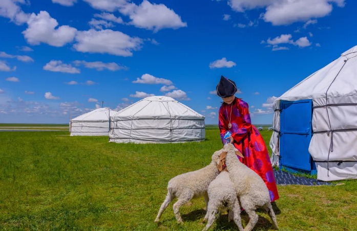 • [Достопримечательность/опыт] Долина ветров, Пограничный пункт, Дом пастуха, Эньхэ — Долина ветров/Улыбающаяся река/Березовый лес — Пограничный пункт (пересечение пограничного шоссе/вид на таидзи-диаграмму издали) (48 км, примерно 1 час езды) в Хэйшаньтоу (84 км, примерно 2 часа езды) в Дом пастуха (переодеться монголами/кормить ягнят/доить коров/мини-поезд по степи) — Жареный целый бараний туловий — Закат в степи