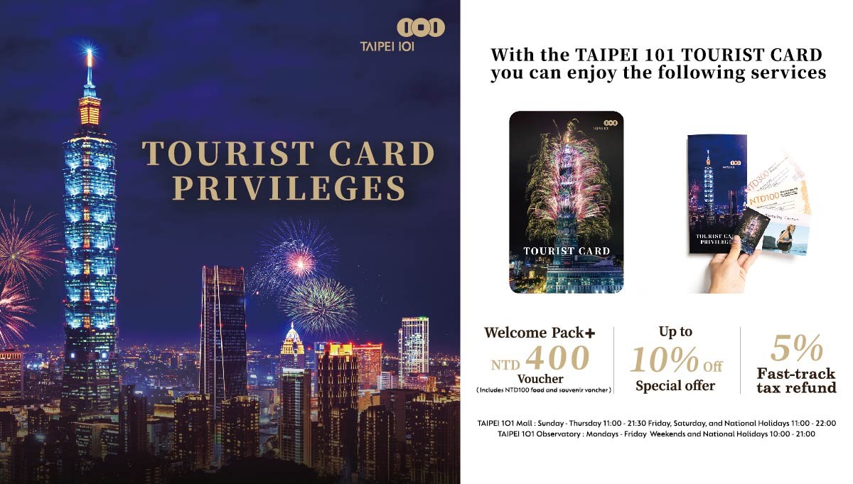 - **[Non-Taiwanese exclusive]** Free [Taipei 101 Tourist Card](https://www.taipei-101.com.tw/en/shopping/tourist): enjoy exclusive privileges, discounts, and tax refund service