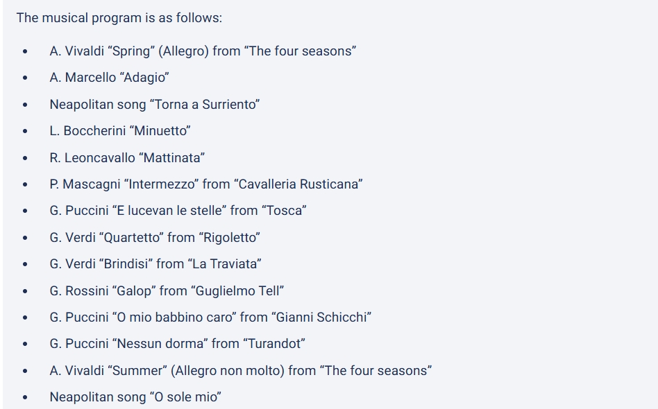 Before the concert begins, you’ll have the chance to visit the palace exhibitions. The last entry is at 18:30, and the visit concludes by 19:00. Access to the exhibitions is at Via della Stamperia 6 (A street parallel to Via Poli)