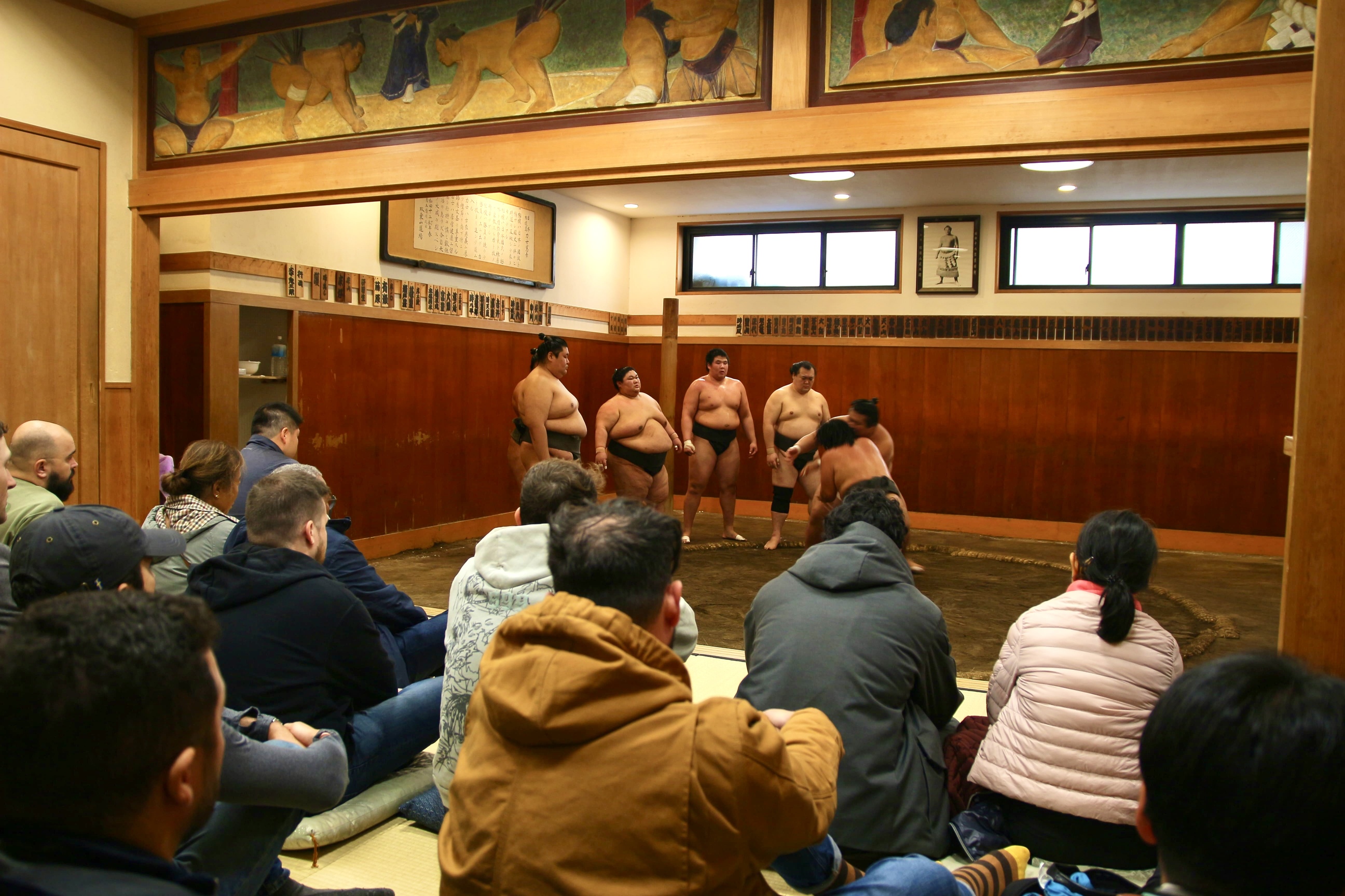 - [Attraction/experience] 3 hour(s), Guided tour, Morning Practice Viewing at Sumo Stable, Q&A and Photo sessions w/ Wrestlers., Practice usually lasts about 1.5 hours, and during the Grand Sumo Tournament period, it lasts 1 hour..Some attractions might need to skipped because of capacity or weather conditions