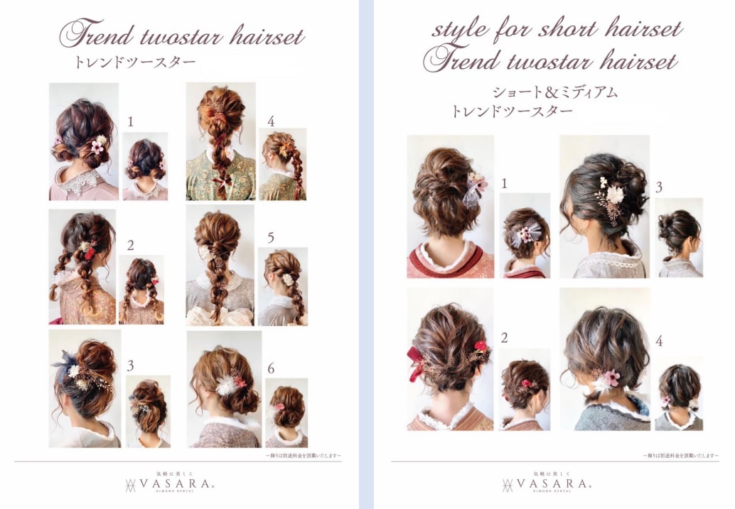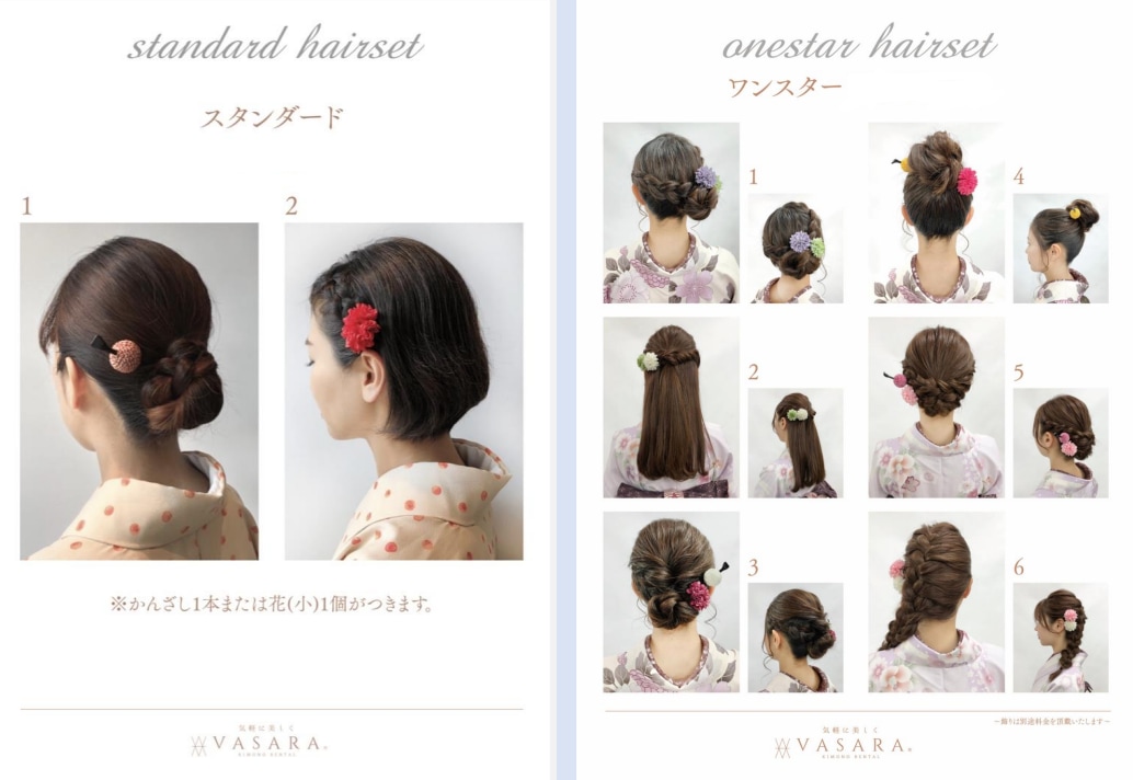 - For Women (Deluxe) : Complete kimono set (select from the Retro Premium rank including VASARA original kimono), includes 3 optional items (such as lace, hair accessories, or jewelry), and Two-Star rank hair styling.