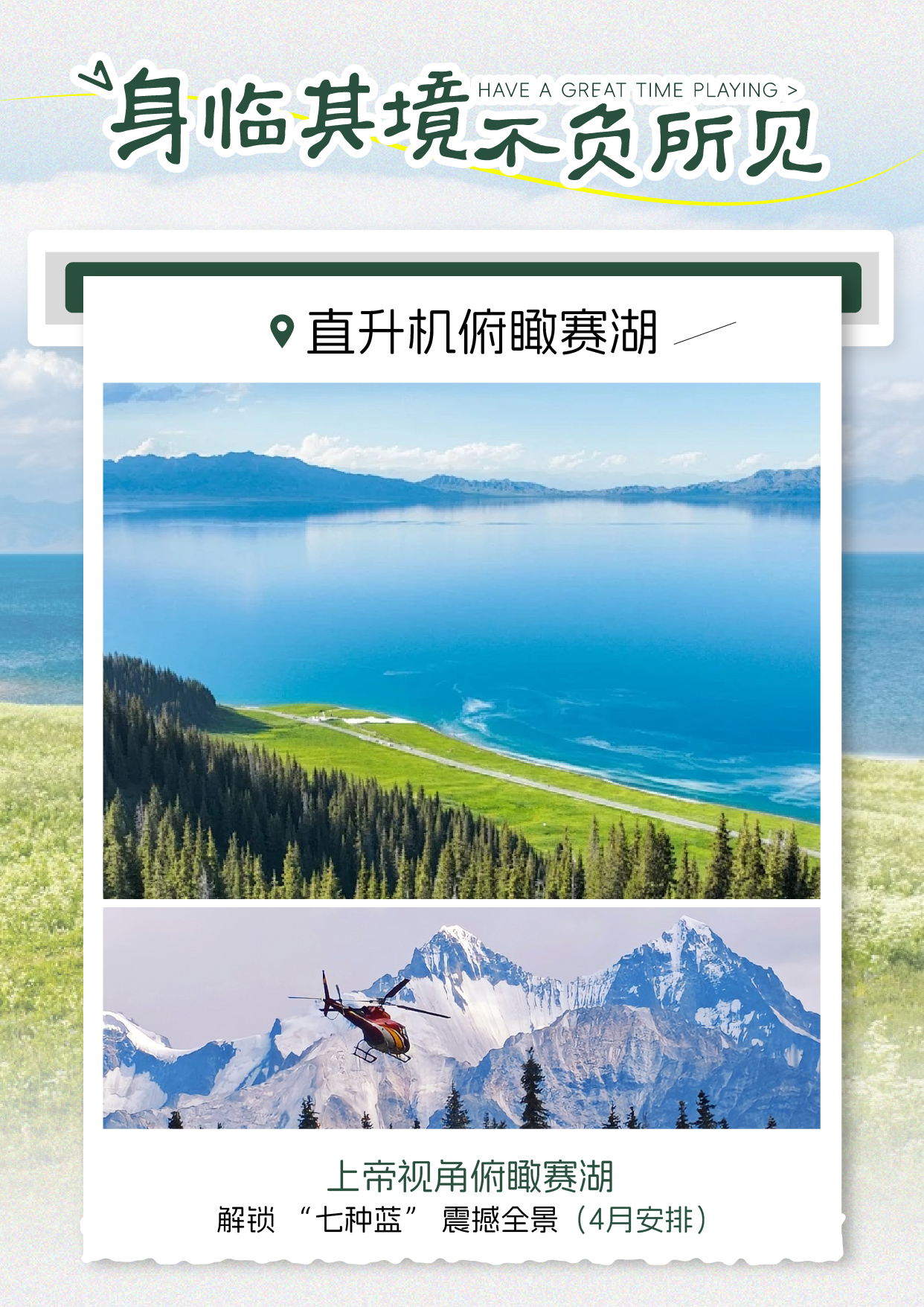 - [Attraction/experience] 3 hour(s), Self-guided, Sayram Lake, Sayram Lake Helicopter Experience, Drive around Sayram Lake. Check in at Qinshuitan, Dianjiangtai, Xihai Grassland, Kleyongzhu, Internet-famous S-Bay, and Songshutou to unlock celebrity-style photo spots.