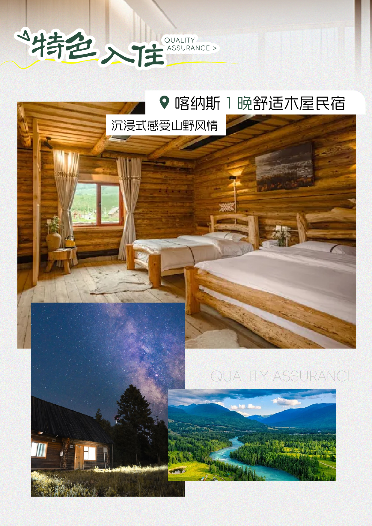 - [Accommodation] Kanas Huajianfang Log Cabin; Tonight, stay in a cabin within the Kanas Scenic Area, either Xiaojiuyue/Huajianfang or a similar-grade cabin.
