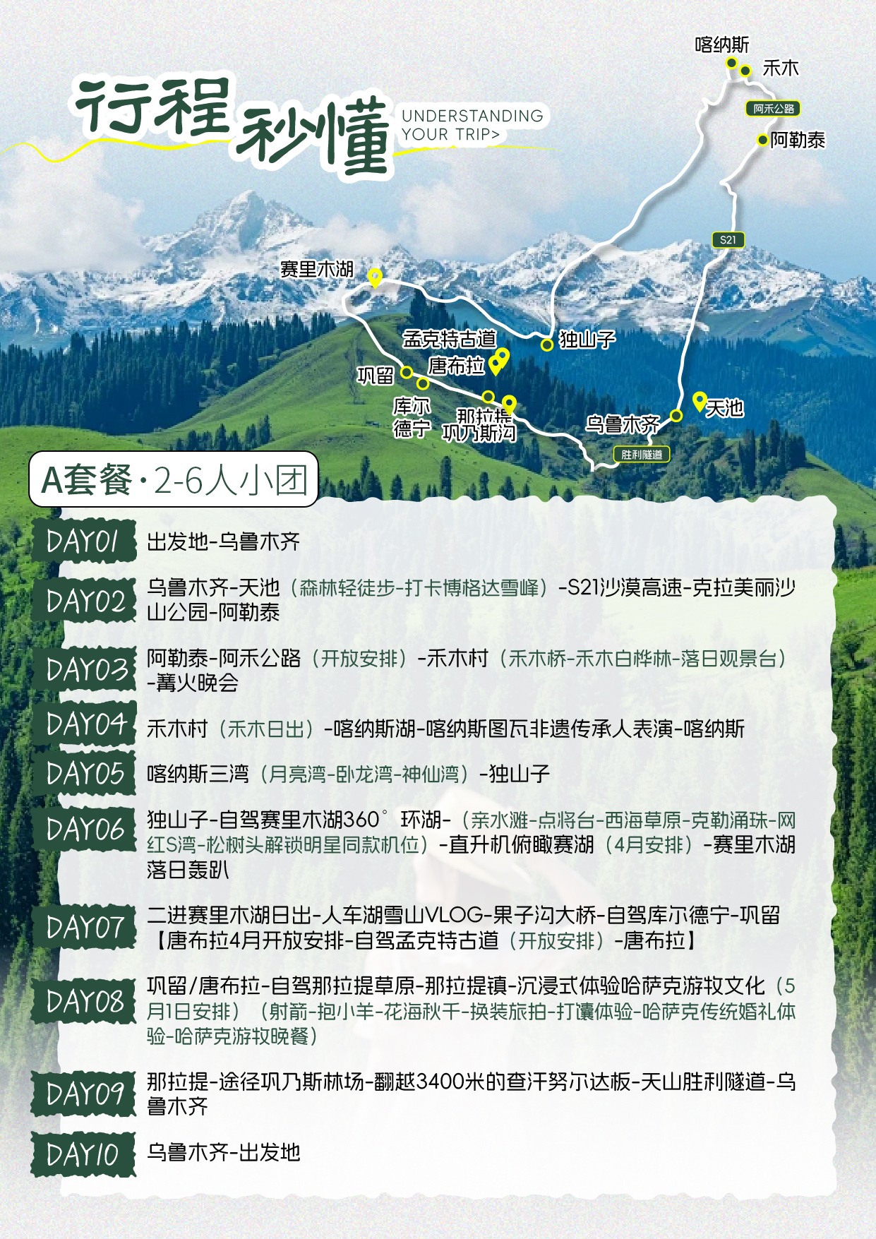 - 2. Scenic spot tickets: Scenic spot tickets and scenic area shuttle buses listed in the itinerary: Tianshan Tianchi tickets and shuttle buses, Hemu tickets and shuttle buses, Kanas tickets and shuttle buses, Sayram Lake self-driving tickets, Mengket Ancient Road self-driving tickets, Nalati Air Grassland tickets and shuttle buses;