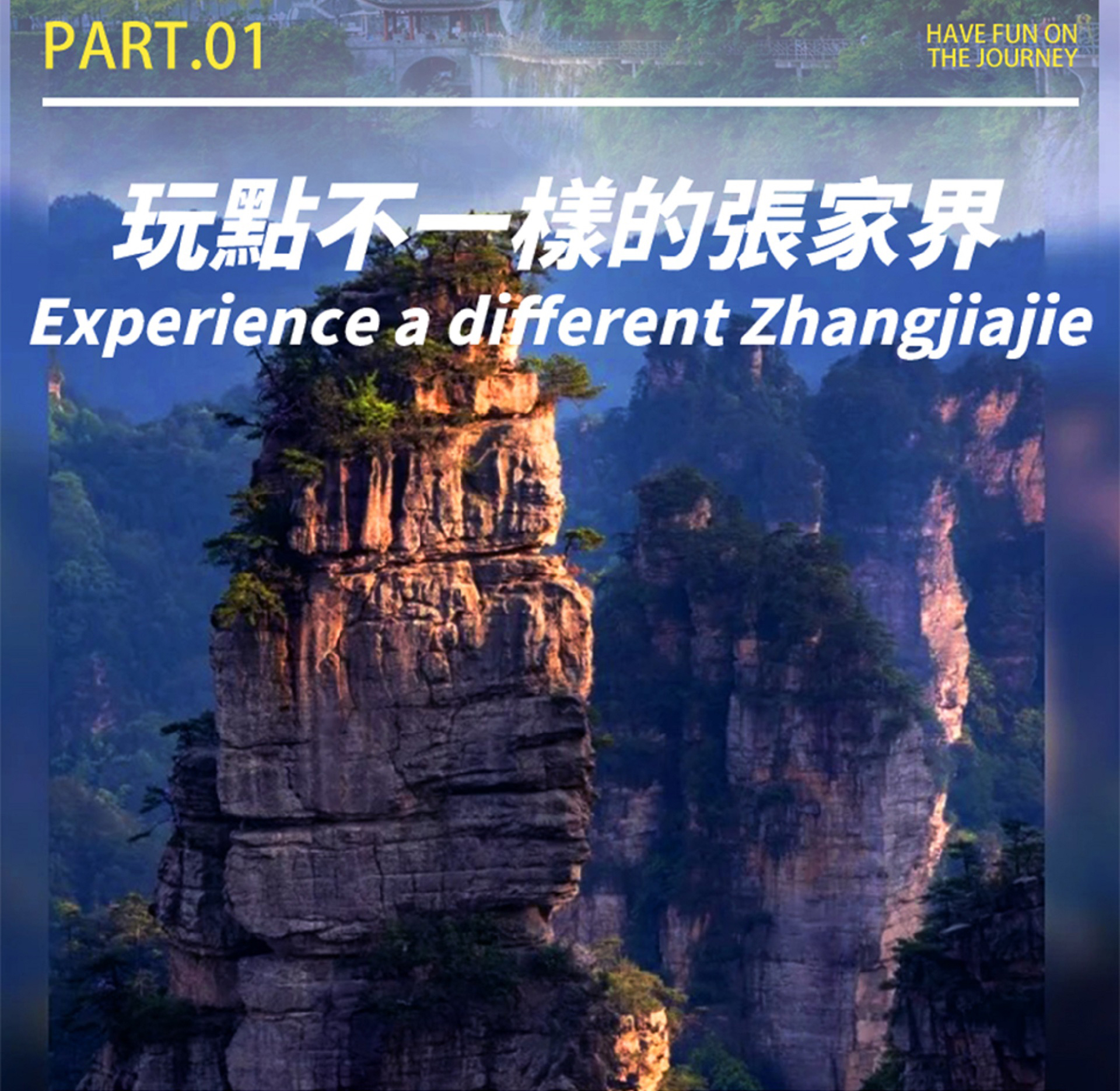 - [Attraction/experience] Self-guided, Yuanjiajie, The inspiration for Avatar's Hallelujah Mountains—explore the floating mountains and the fantastical world of scattered peaks from the movie Avatar; visit the Bewitching Platform, shrouded in mist and clouds with overlapping peaks and majestic momentum, as well as the unparalleled aerial views of the First Bridge Under Heaven and other scenic wonders.