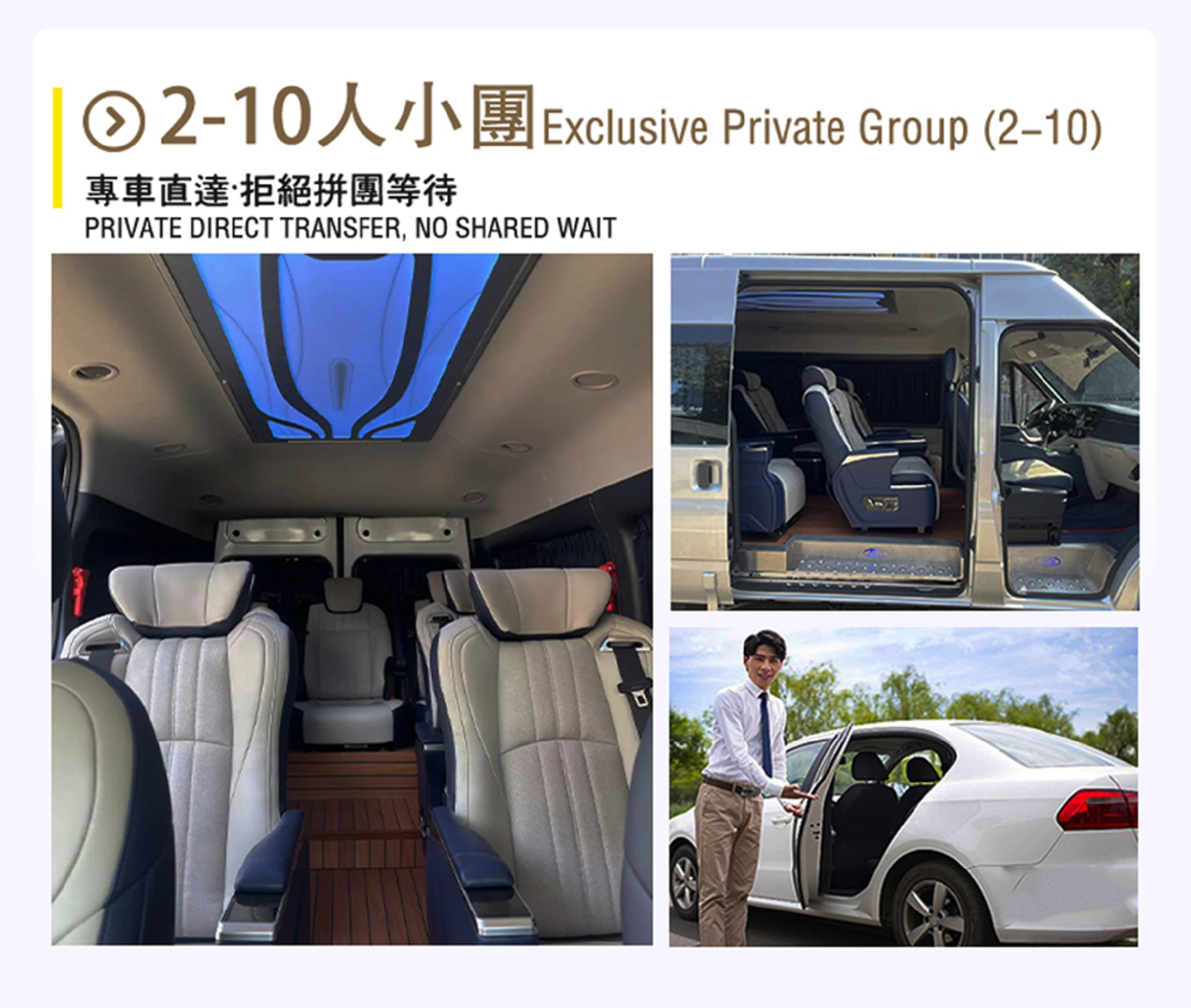 - Tour Guide: Dedicated tour guide service (For groups of less than 5, a professional driver will also serve as the guide)
