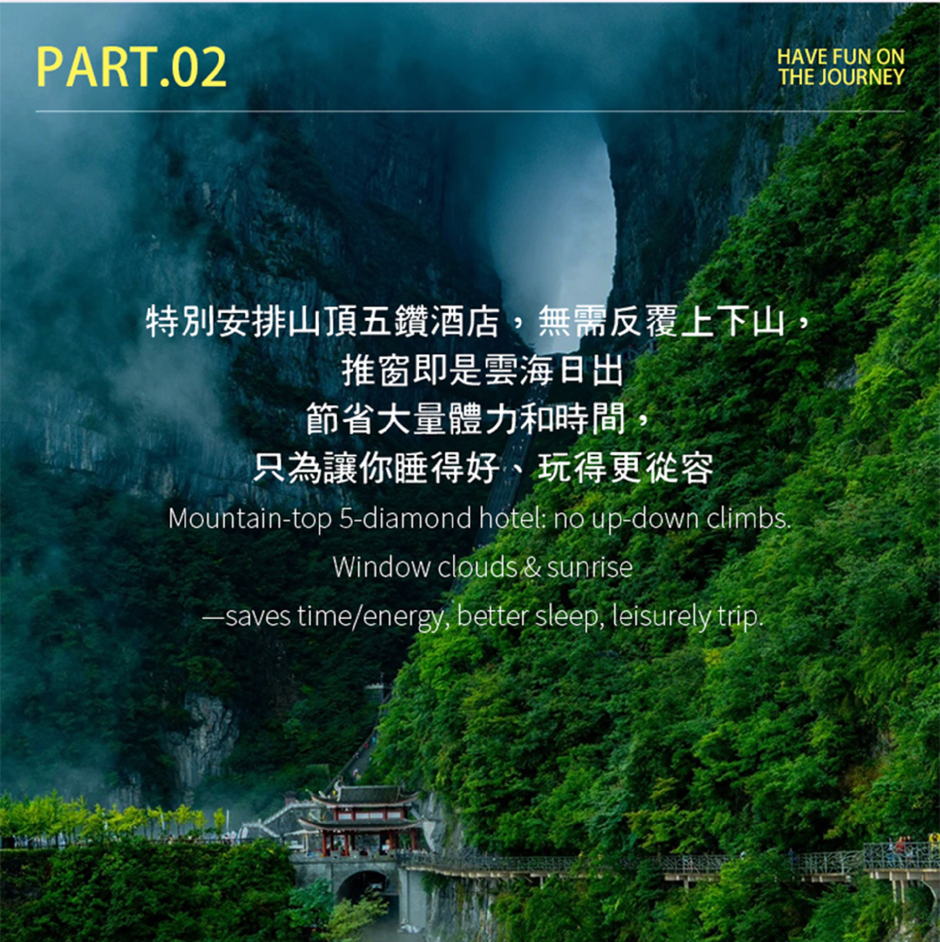 - [Attraction/experience] Heavenly Avenue, 【Tongtian Avenue】: The winding mountain road known as Tongtian Avenue has a total of 99 bends, giving rise to the "World's First Highway Wonder." 【Tianmen Cave Opening】: Nine hundred ninety-nine steps lead up to Tianmen Cave, a rare high-altitude karst cave piercing through the mountain. 【Guigu Plank Road】: The entire route is built in the middle of a ten-thousand-foot cliff, giving people the feeling of rising and falling with the cliff.