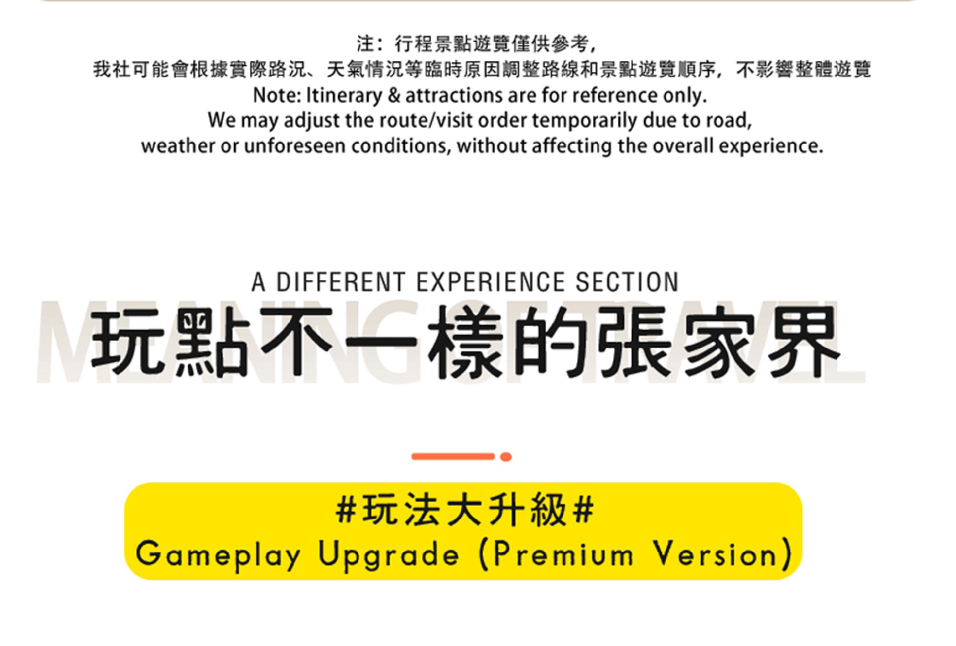 - Times listed in the itinerary are for reference only and are subject to actual conditions on the day of the tour. Please be aware that the itinerary is subject to change and adjustment due to factors such as weather, road conditions, holidays, arrival and departure times, queueing and control at scenic spots, tourists themselves, and force majeure. Thank you for your understanding.