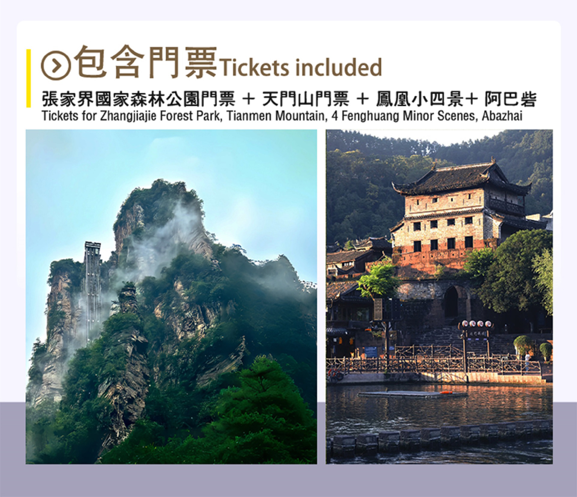 - Tickets: Zhangjiajie National Forest Park ticket + Tianmen Mountain National Forest Park ticket + Aizhai Bridge + Cliff Plank Road + Abazhai. Complimentary small transportation: Huangshizhai Cableway round trip + Yangjiajie Cableway one way + Tianzishan Cableway one way + Bailong Elevator one way + Aizhai Bridge two-way escalator + Aizhai Bridge elevator + Tianmen Mountain Cableway/escalator