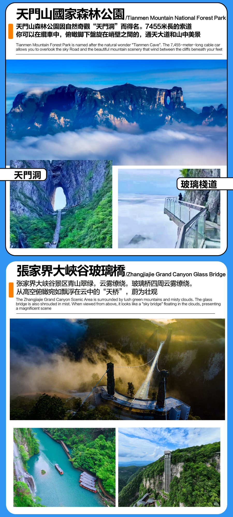 - [Attraction/experience] 08:00, Tianmen Mountain, Tianmen Mountain Glass Walkway, Escalator through the mountain, 天门山鬼谷栈道, Tianmen Cave, 云梦仙顶, Experience the longest cable car in Asia!!
